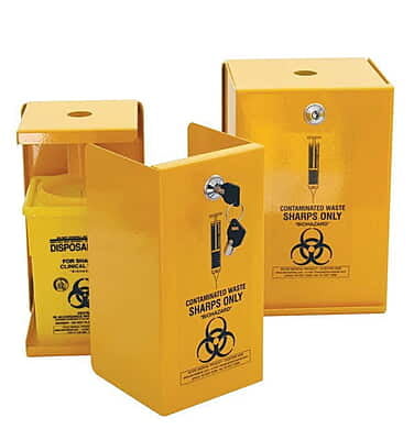 SHARPS METAL SAFE, 5L, YELLOW ARMOUR, INCLUDES 2 SQUARE 5L PLASTIC SHARPS CONTAINERS