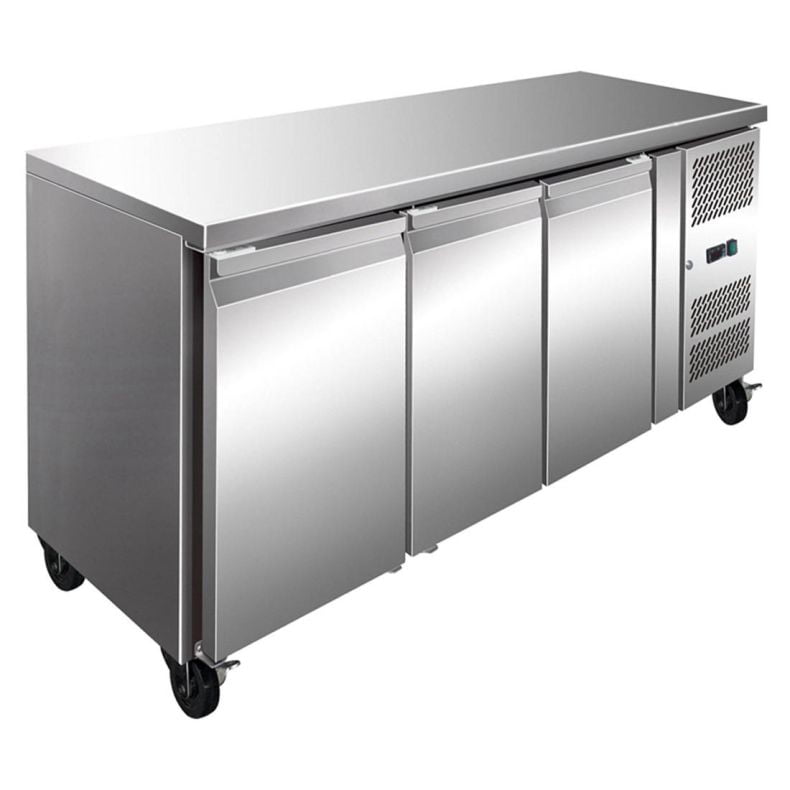S/S Three Door Bench Freezer 386L - FE3100BT FE3100BT is a strong three door commercial workbench freezer with multiple accompanying features. This unit can hold up to 386 litres in capacity, with dimensions set at 1795x600x860+50mm. The interior is icy cold, meaning you can store stock and ingredients inside for the long-term. These ingredients or meals can then be taken out later and still retain a fresh state. You can also use this interior to store other equipment or tools as well. This classic workbench freezer is built with a stainless-steel interior and exterior, electronic thermostat, auto defrost and fan-forced evaporator cooling. Pick up one of FED’s most reliable workbench freezers today! Refrigerated: -18 to -22ºc Capacity: 386 Litres Commercial Bench Freezer One Level of Shelving Plus Floor Elitec Digital Temp. Control & Read-Out 304 Stainless Steel Interior & Exterior Fan-Forced Evaporator Cooling CFC Free Refrigerant and Foam AISI 304 Stainless Steel Framework Construction Electronic Thermostat and Digital LED Temperature Display for Accurate Control and Easy Reading Auto Defrosting and Auto Evaporation of Condensation Water Magnetic Gaskets Can Be Replaced without Any Tools Bottom with Round Edges for Easy Cleaning Capacity 386 ltr * Interior: 1230x480x560mm * Exterior: 1795x600x860mm 2 Years Parts and Labour + 2 Years Parts only Warranty with Product Registration