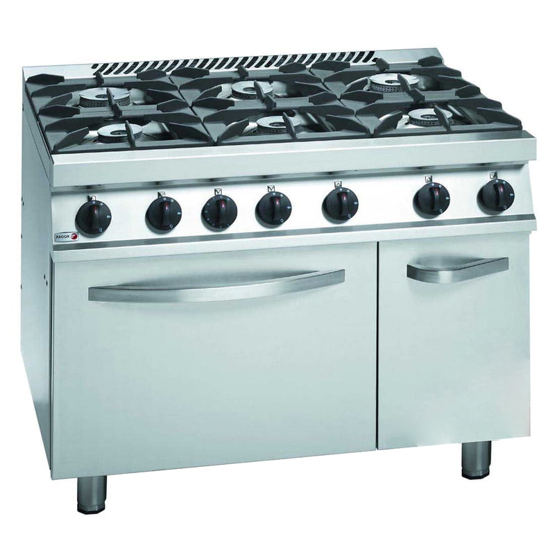 Fagor 700 series natural gas 6 burner with gas oven (GN 2/1) and neutral cabinet under CG7-61H The gas cookers in the 700 Series may be fitted with open burners, ovens, fry-tops, hotplates, pasta cookers, barbecues, cooking pots, fryers, bain-marie and Bratt pans, combined in different ways to meet the needs of each customer. Made of austenitic stainless steel, the cookers in this range have tilted control panels to provide better access to the buttons and controls on the front of the machine, in addition to built-in handles and grease collection trays. The equipment in the 700 Series is formed by machines with the highest operating powers on the market, with excellent performance and recovery ratios. Made of stainless steel. Open hobs with safety valve and thermocouples. Pilots for ignition. Cast iron gratings and burners. Burners: 6x6.9 kW Dimensions of the grill: 347x310 mm. Fat collector under the grids. 2/1 GN oven made of stainless steel, with tubular burner in stainless steel. Pilot and thermocouple. Thermostatic control (130 ºC - 350 ºC).Oven burner: 7.8 kW.Auxiliary neutral cabinet.Total power: 49.2 kW.Dimensions: 1050 x 775 x 850 mm. 2 Years Parts and Labour + 2 Years Parts only Warranty with Product Registration