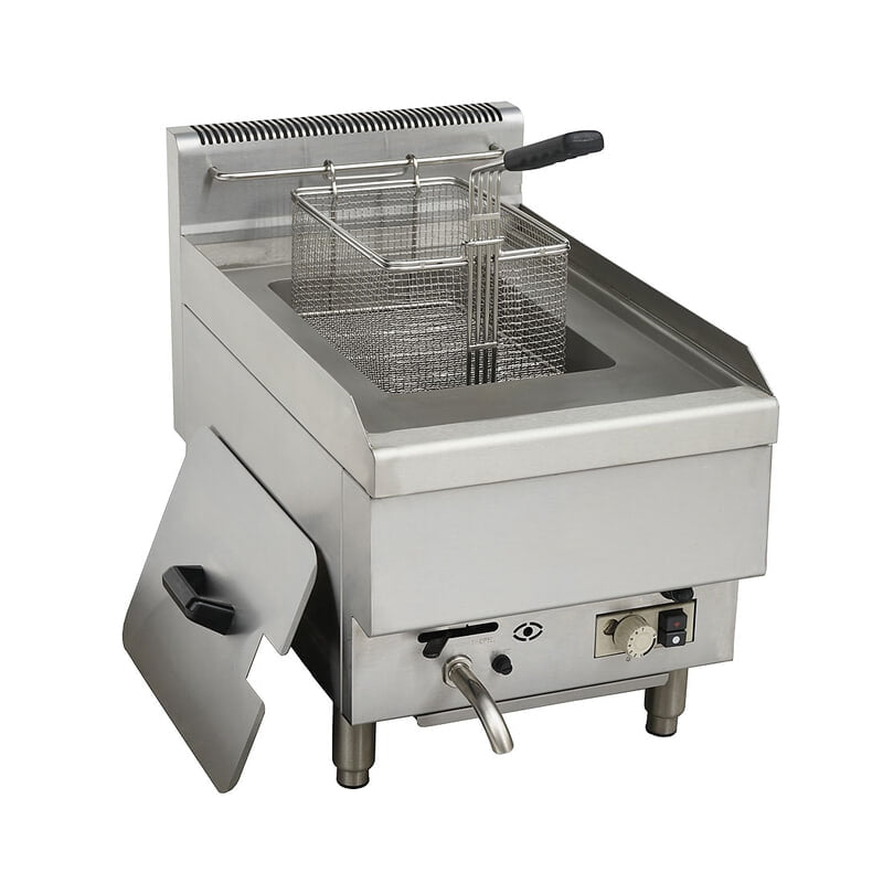 Gas Type: LPG Oil Tank Capacity: 10L Stainless steel construction Compact design Italian gas valve Sturdy adjustable feet Food van friendly Optional stand Front mounted drain for easy cleaning and maintenance Includes Stainless Steel Lid Fast recovery 14mj (3.9kw) burner Automatic Ignitor and Pilot Light 2 Years Parts and Labour + 2 Years Parts only Warranty with Product Registration within 14 Days of Invoice