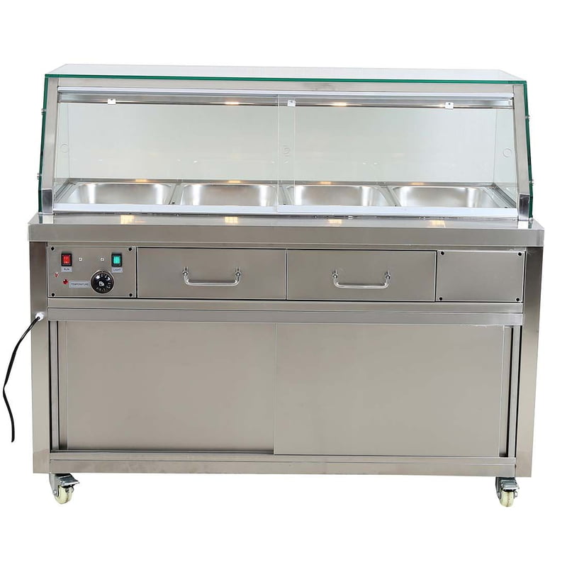 Heated Stainless Steel Bain Marie Food Display - PG150FE-YG The Thermaster premium stainless steel bain marie series is the ideal inclusion for restaurants and takeway stores requiring a slow cooking process for their meals and ingredients. These bain marie units come with sliding doors for easier access, water drawers, thermostat, a halogen heating lamp, heating elements, plumbing free installation, a perforated pan divider, castors and a convective thermal air-flow. Two doors with 4 x 1/1 GN pans 35 to 85°C / convective thermal air-flow & humidity Bench height is 850 mm Two drawers Two sliding cabinet doors Quartz lighting over pans Thermostat All Stainless Steel Easy to clean Castors Frameless 45° joints Net Capacity: 600L * Pans not included Hot food holding cabinets only, not designed to heat product 2 Years Parts and Labour + 2 Years Parts only Warranty with Product Registration