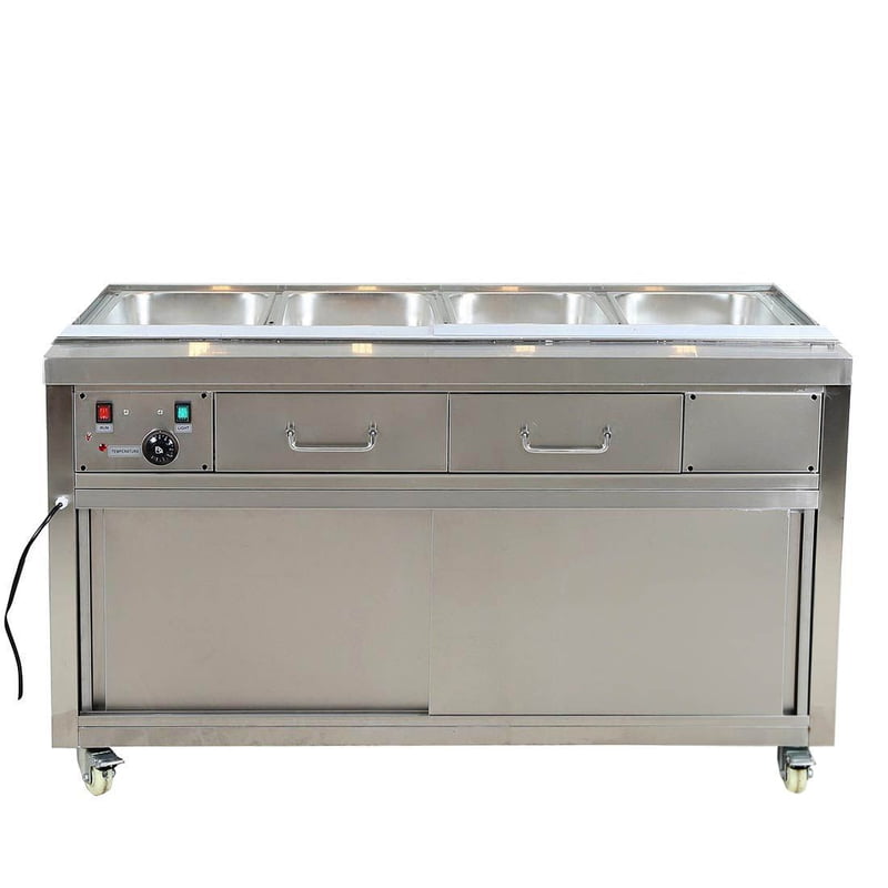 Heated Stainless Steel Bain Marie Food Display without Glass Top - PG150FE-B The Thermaster premium stainless steel bain marie series is the ideal inclusion for restaurants and takeway stores requiring a slow cooking process for their meals and ingredients. These bain marie units come with sliding doors for easier access, water drawers, thermostat, a halogen heating lamp, heating elements, plumbing free installation, a perforated pan divider, castors and a convective thermal air-flow. Two doors with 4 x 1/1 GN pans 35 to 85°C / convective thermal air-flow & humidity Bench height is 850 mm Two drawers Two sliding cabinet doors No glass top Quartz lighting over pans Thermostat All Stainless Steel Easy to clean Castors Frameless 45° joints * Pans not included Hot food holding cabinets only, not designed to heat product 2 Years Parts and Labour + 2 Years Parts only Warranty with Product Registration