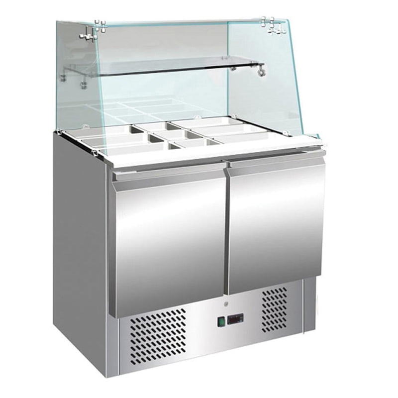S900GC Compact Food Service Bar Two Door Stainless Steel Interior & Exterior 6 × 1/3 GN + 3 × 1/6 Pans Refrigerated 2 to 8°C Ambient 32ºc & 90% Rh Panasonic Designed Compressors On Castors Can Be Positioned Against Walls Digital Temp. Controls With Led Display Fridge Has One Level Of Shelving Plus Floor Fan Assisted Cooling Auto Defrost Self Evaporating Drainage Touch Close Doors PE Cutting Board Included Internal Corners Rounded For Hygiene & Easy Cleaning Stainless Steel Framework Castors Capacity 257 ltr * Gal Metal Back * Pans Not Included (View Our Range Of Pans Under The Gastronorm Pans Category) * Tops Are Holding Units & Product Needs To Be Pre-Chilled To Less Than 5ºc Before Filling * In These Units It Is Normal For Condensation To Collect On The Floor & For The Walls To Show Frost 2 Years Parts and Labour + 2 Years Parts only Warranty with Product Registration