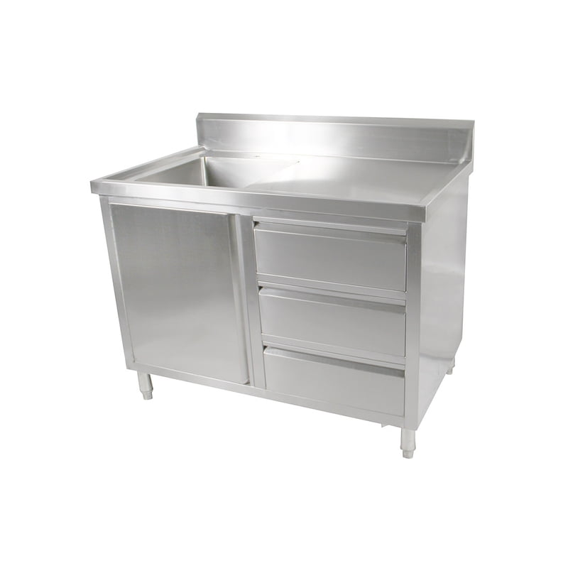 Great for open kitchensLeft Sink1200 mm wideALL STAINLESS STEEL KITCHEN TIDY CABINET WITH SINK, DOORS & DRAWERS 600 mm deep × 900 mm high + 150 mm splashback "Punched" bowls Bowl size 400mmW×400D×300H 90 mm Ø drain hole Pre-assembled with all welded joins Top: 1.2 mm; SUS304 grade Doors & drawers are 0.9 mm Tops have reinforced lining Cabinets come fullly assembled 2 Years Parts only Warranty