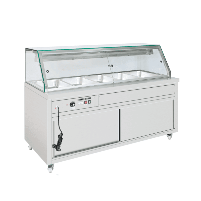 Thermaster Wet and Dry Bain Marie Display 5x1/1 GN Pans PG180FE-XG Key Features Fits 5x 1/1GN Temperature: 35 to 85 Can operate as wet and dry bain marie Convective thermal air-flow & humidity bench Tempered glass canopy Clear sliding doors for serving area Halogen heating lamp with light cover and separate switch Heating elements submerged in water Ambient storage cabinet under with sliding doors Perforated pan divider All stainless steel Analogue temperature control Temperature Reach Indication light Analogue temperature display Castors Streamlined for easy cleaning Fits GN pans up to 150mm deep * GN Pans not included. Pans and dividers must be fitted at all times. * Hot food holding cabinets only, not designed to heat product Warranty: 2 Years Parts and Labour + 2 Years Parts only Warranty with Product Registration