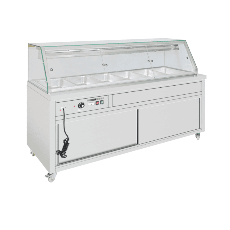 Thermaster Wet and Dry Bain Marie Display 6x1/1 GN Pans PG210FE-XG Key Features Fits 6x 1/1GN Temperature: 35 to 85 Can operate as wet and dry bain marie Convective thermal air-flow & humidity bench Tempered glass canopy Clear sliding doors for serving area Halogen heating lamp with light cover and separate switch Heating elements submerged in water Ambient storage cabinet under with sliding doors Perforated pan divider All stainless steel Analogue temperature control Temperature Reach Indication light Analogue temperature display Castors Streamlined for easy cleaning Fits GN pans up to 150mm deep * GN Pans not included. Pans and dividers must be fitted at all times. * Hot food holding cabinets only, not designed to heat product Warranty: 2 Years Parts and Labour + 2 Years Parts only Warranty with Product Registration