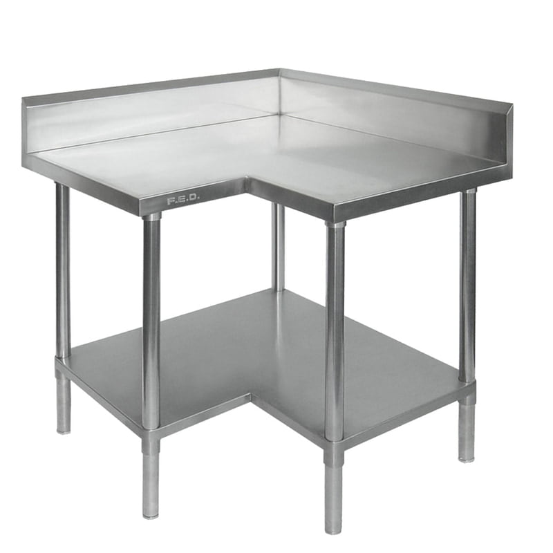All Stainless Steel Corner Workbench with Splashback and Solid Undershelf - WBCB6-0900/A 900mm Wide 150mm Splashback 900 mm deep × 900 mm high Specially designed for quick & simple assembly Comes with instruction manual & tools Supplied flat-packed for ease of transport Locking drawers available* Legs 1.2 mm S/S; 42 mm Ø Fully adjustable S/S polished disc feet that match the legs perfectly Castor kits available (lockable) Benchtops 1.2 mm material; SUS304 (18/8) Llined with XPS board, 20 mm thick & S/S panel Special S/S ‘U’ channel reinforcements under - As the bench size increases so does the number of channels Undershelves Height of shelf is fully adjustable, also an extra shelf can be added 1.2 mm S/S Special ‘U’ channel reinforcements under to suit the bench type & size, and as the bench size increases so does the ‘U’ channel width; S/S 1.2 mm thick Splashbacks Stainless steel backing All S/S lined & bevelled 150 mm high; 30 mm thick Fully enclosed & folded under top (not gal. or open) 2 Years Parts only Warranty